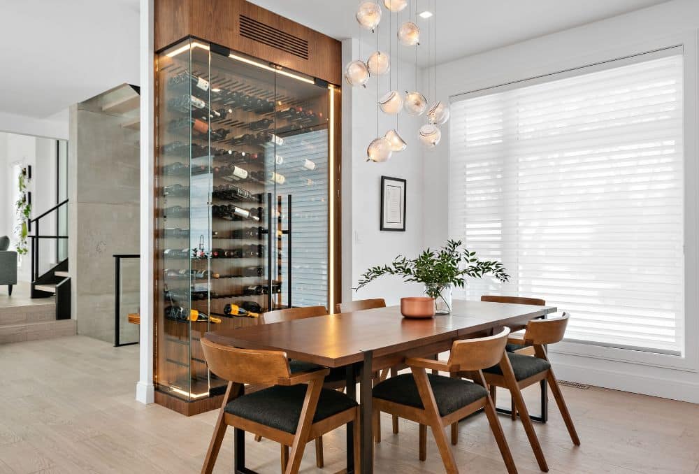Architectural Chicago wine display walls that read as furniture in the living room and