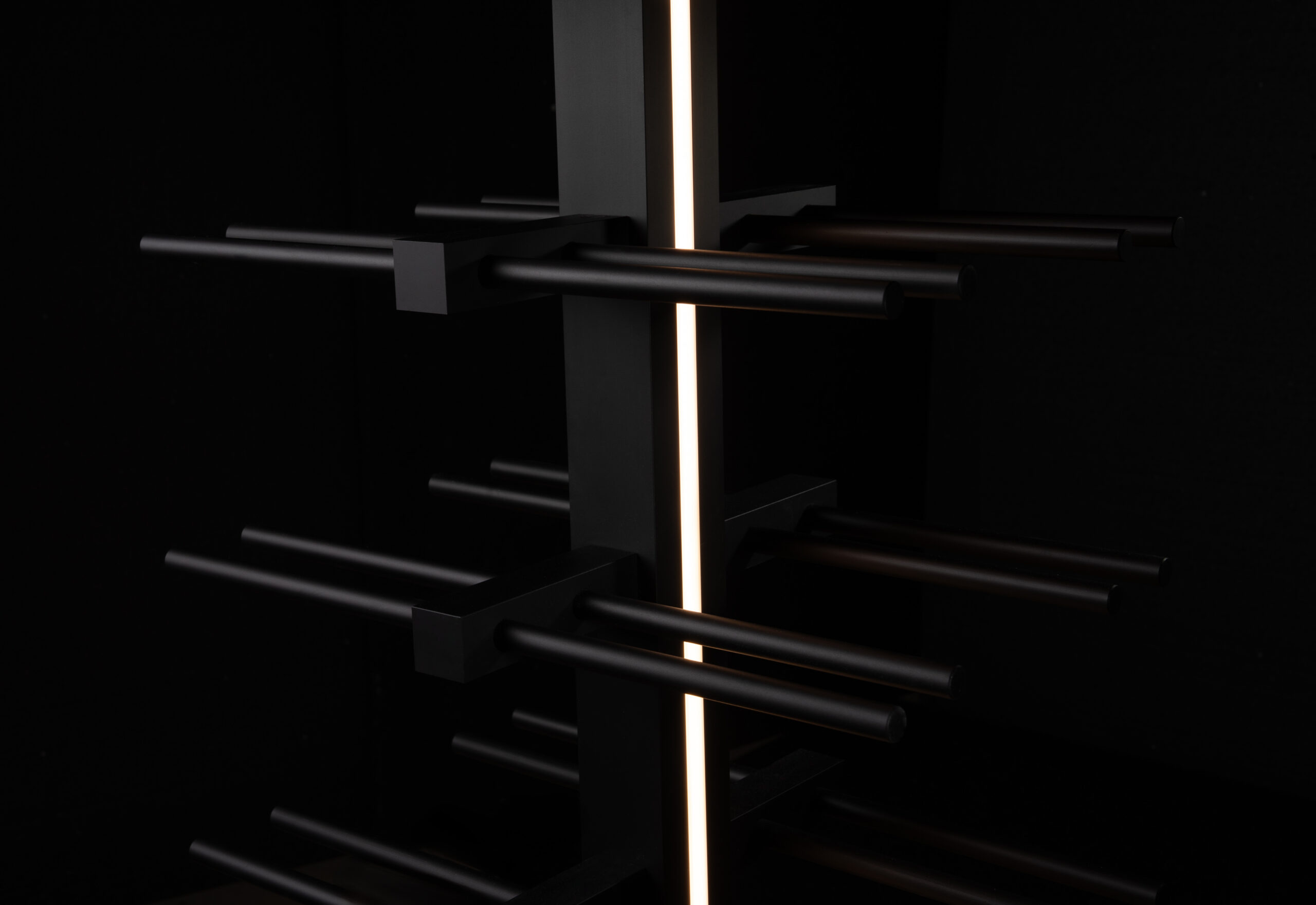 Fabricated from precision-machined aluminum and finished with disciplined restraint, the structure absorbs light rather than competing with it. Integrated illumination within the spine enhances depth and orientation, elevating both the bottles and the surrounding architecture.