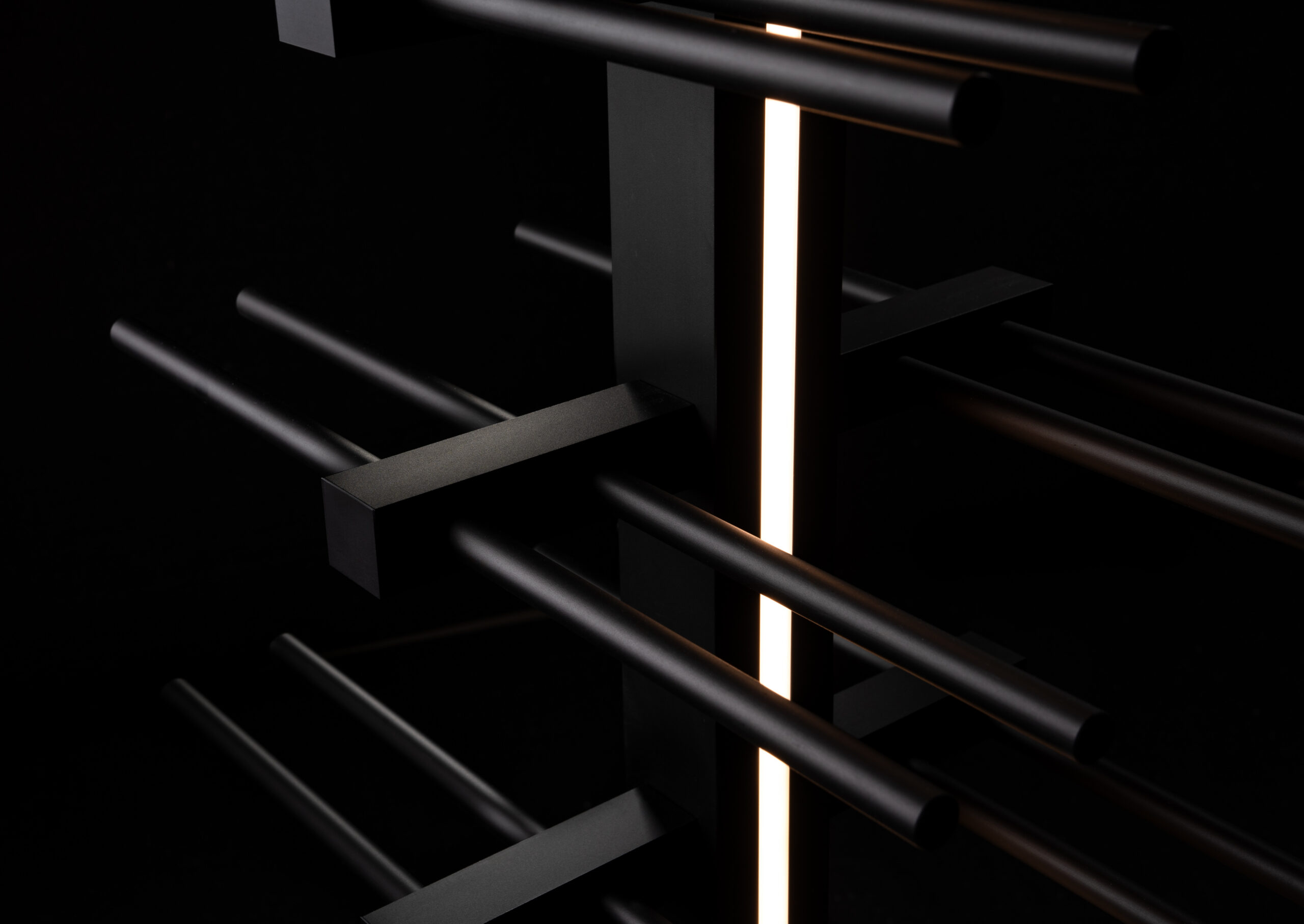 At the core is a single, solid aluminum spine — precision-machined to serve as both structure and visual anchor. From this vertical axis, cantilevered supports extend outward with measured proportion and exact alignment.